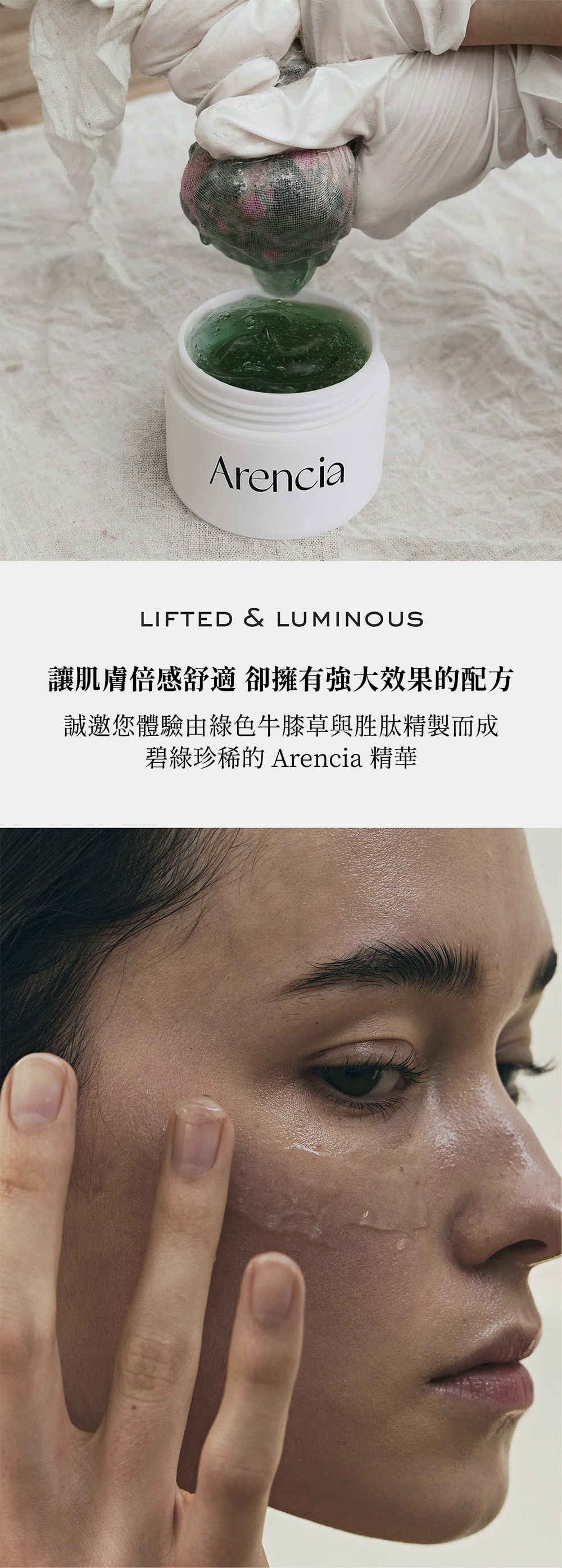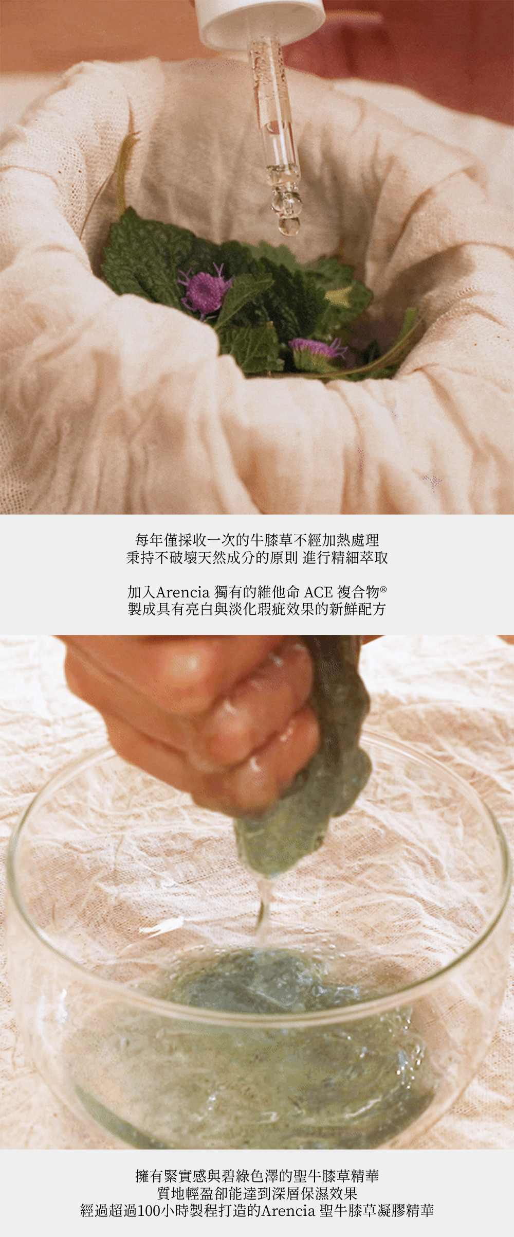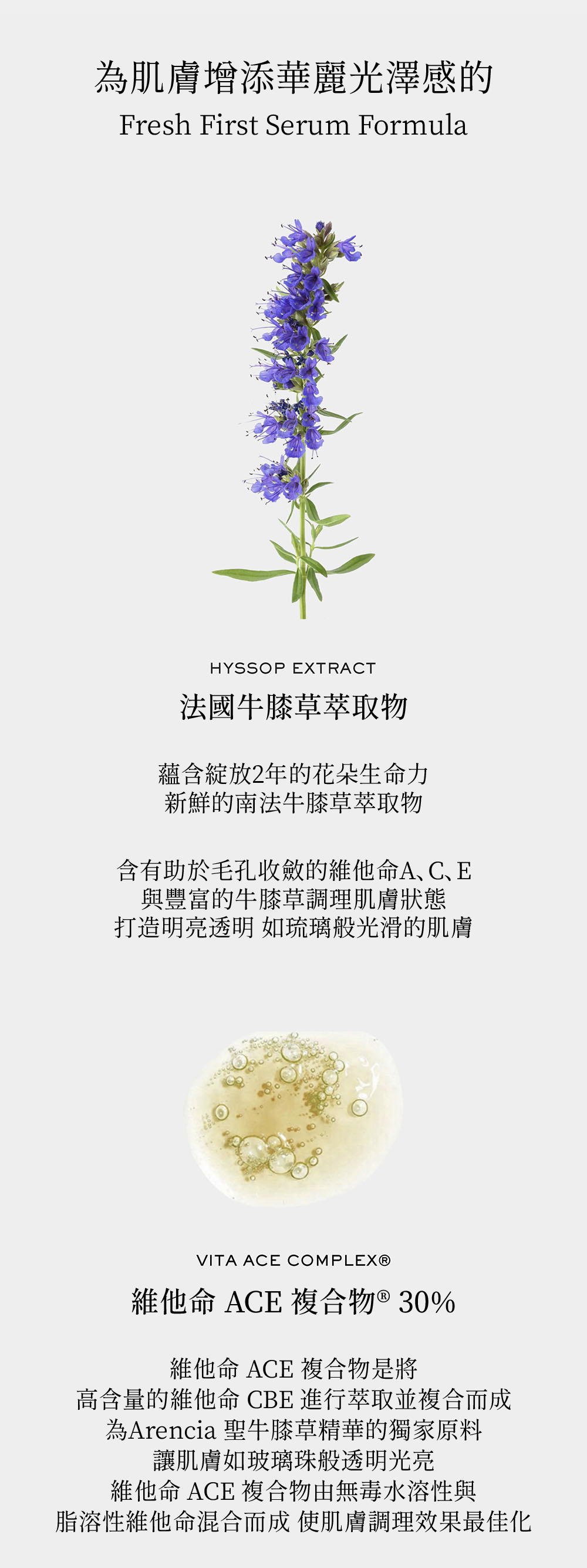 以法國牛膝草萃取為基底成分,含有維他命 A、C、E 打造明亮如琉璃般光滑的肌膚。